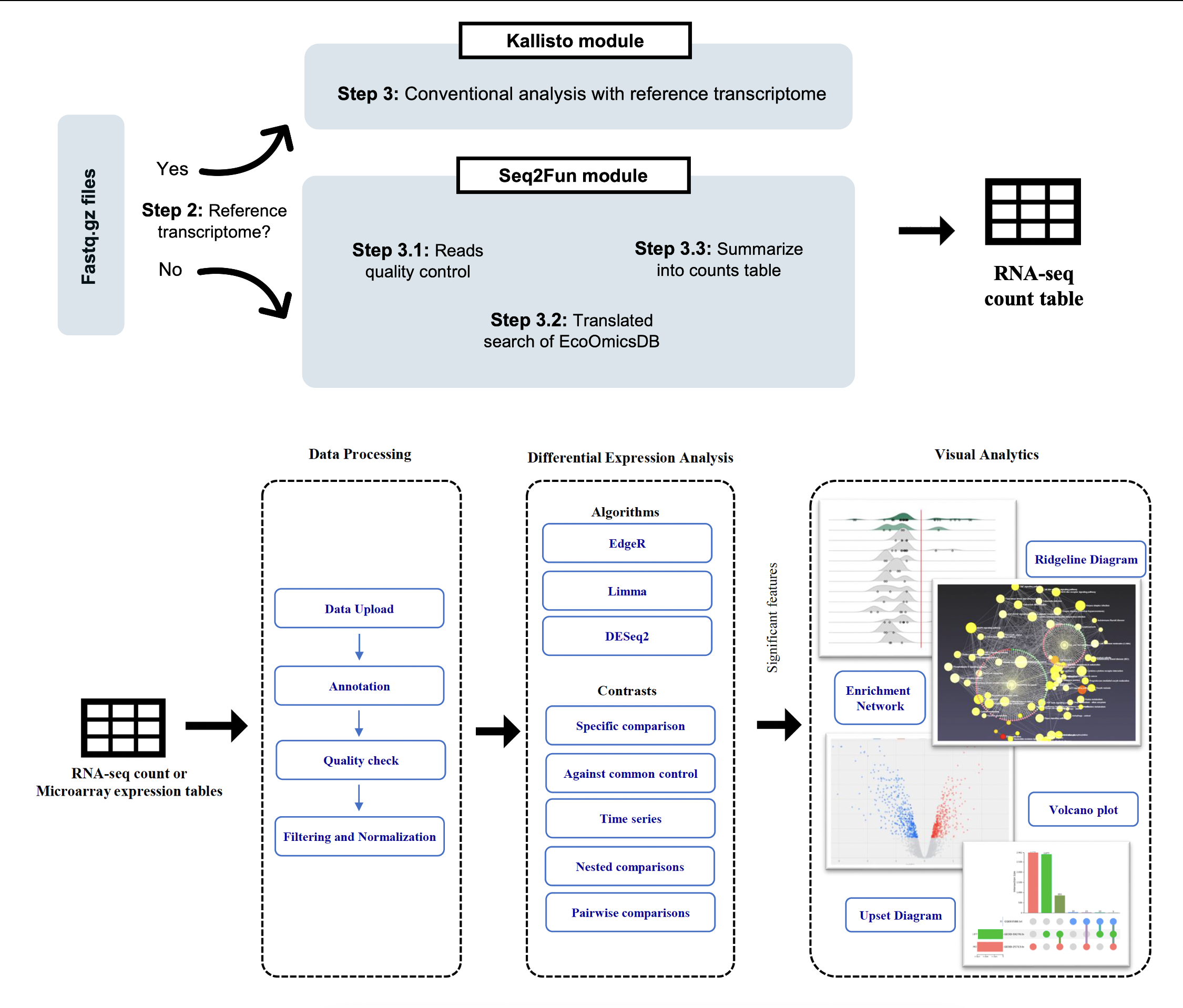 ExpressAnalyst is a unified, web-based platform that enables streamlined RNAseq processing, statistical analysis and functional interpretation for transcriptomics data in a largely species independent manner